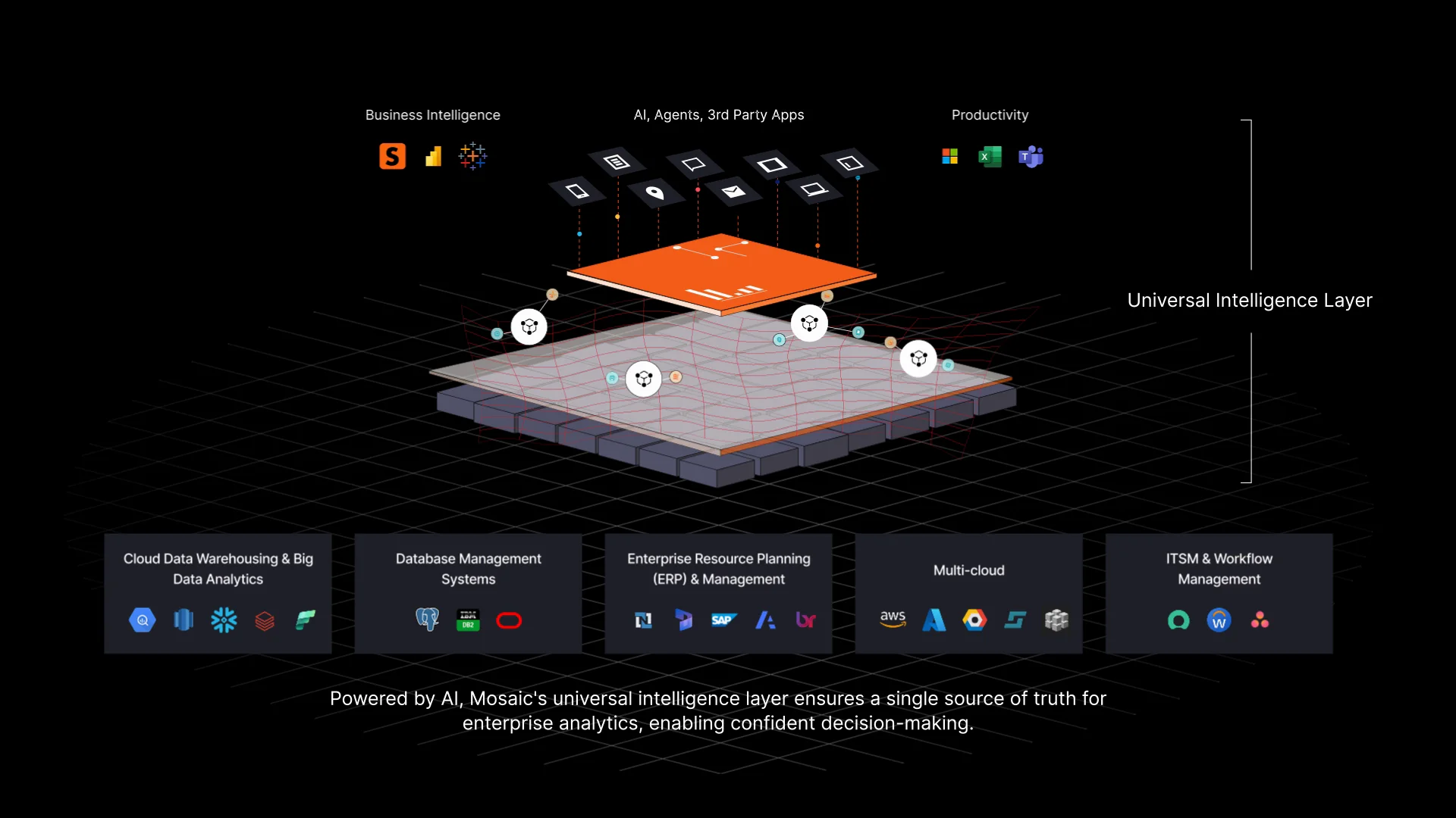 Strategy Mosaic은 별도 시스템 변경 없이 사내에 흩어져 있는 데이터를 모아 하나의 공통 언어로 표준화합니다. Mosaic Studio의 AI 자동화 기능으로 비전문가도 자연어 기반으로 쉽게 모델을 만들 수 있어, SQL 작성과 데이터 준비 시간을 크게 줄일 수 있습니다. 또한 Tableau · PowerBI · Excel 등 기존 도구와도 자연스럽게 연동됩니다.