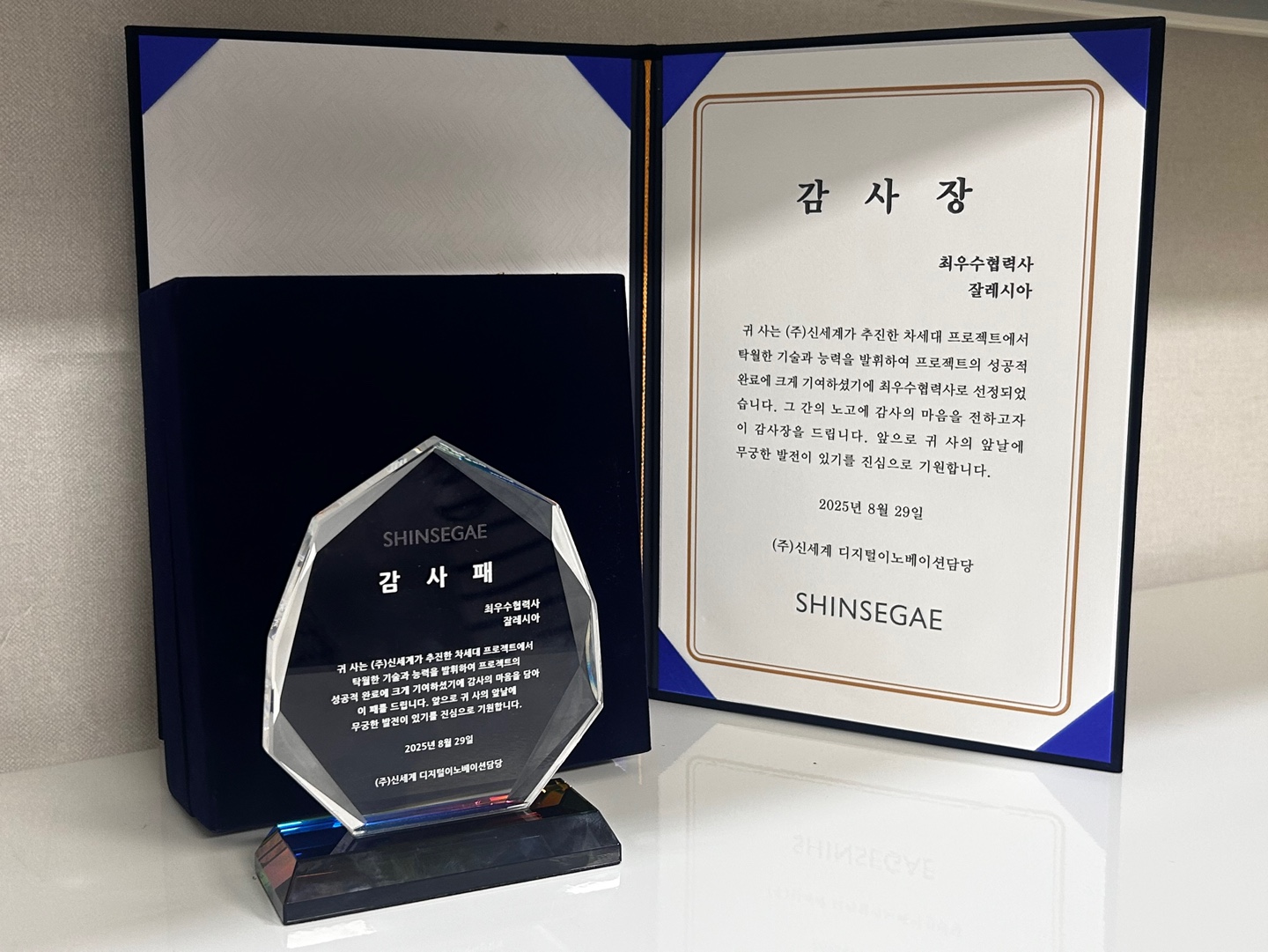 잘레시아가 지난 8월 29일, 신세계로부터 최우수 협력사 감사패를 수상했습니다. 이번 수상은 신세계의 차세대 프로젝트를 성공적으로 수행한 결과이며, 잘레시아의 우수한 기술력과 안정적인 운영 역량을 높이 평가받은 성과입니다. 앞으로도 기업의 데이터 기반 프로젝트 성공을 위해 함께 성장하겠습니다.