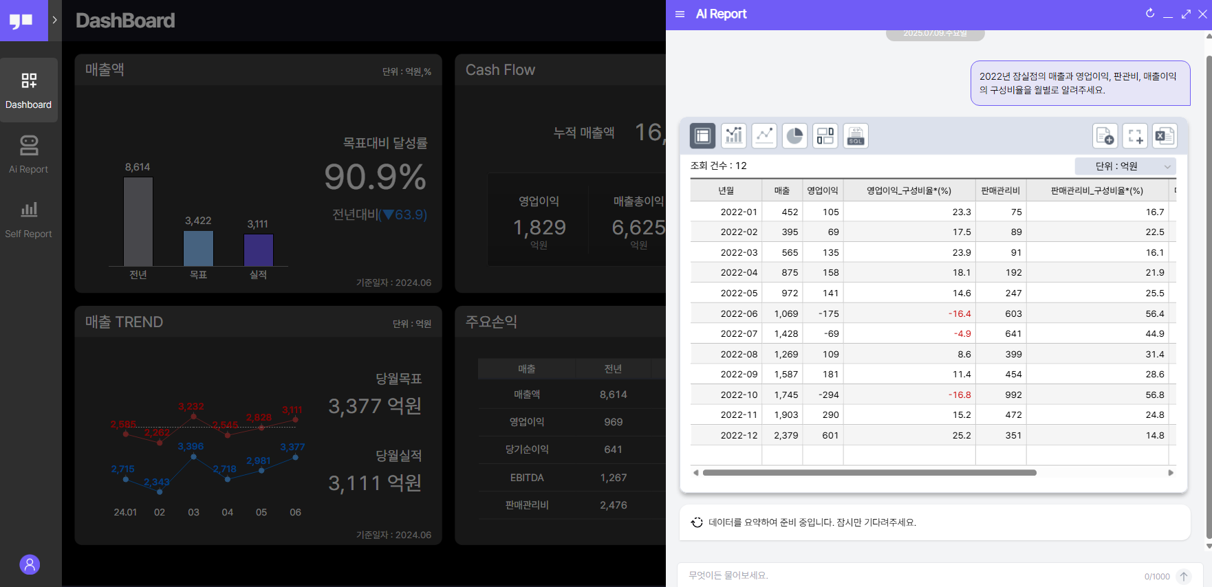 Longview AI는 사용자가 자연어로 질문하면, AI가 필요한 데이터를 자동으로 조회하고 분석해 자연어 질의에 대한 결과를 표 형태로 제공하며 조회된 데이터를 차트 형태의 인사이트로 제공합니다. 복잡한 쿼리 작성이나 BI 전문 지식이 없이도 누구나 빠르게 결과를 확인하고 실무에 바로 적용할 수 있습니다.